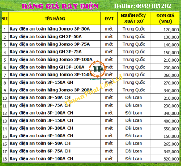 Do có được nguồn hàng giá tốt và không phải qua bất kỳ khâu trung gian nào nên giá ray điện do Công ty thiết bị cầu trục Thuận Phát đưa ra rất cạnh tranh, rất rẻ. Thường nếu Quý khách mua số lượng lớn thì mức giá sẽ rẻ hơn và có nhiều khuyến mãi đi kèm. Để có thêm thông tin chính xác về giá ray điện hãy liên hệ với chúng tôi qua hotline: 0989.105.202.