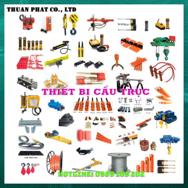 Thiết bị và phụ kiện cho cầu trục bao gồm: Palang điện cáp, palang xích điện, hệ thống điện thanh trượt, hệ thống điện kiểu sâu đo, motor cho dầm biên, tủ điện điều khiển, dây cáp điều khiển, tay bấm, điều khiển từ xa cho cầu trục và những thiết bị và phụ kiện khác cho cầu trục…, được nhập khẩu từ Hàn Quốc, Đài Loan, hàng luôn có sẵn tại kho công ty.